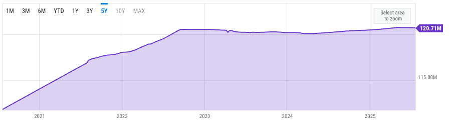 Ethereum ist ein besonderes Tier in Bezug auf das Angebot. Theoretisch ist die Menge der in Umlauf kommenden Ethers flexibel. Seit September 2022 ist die Anzahl der Münzen im Umlauf jedoch sehr stabil.