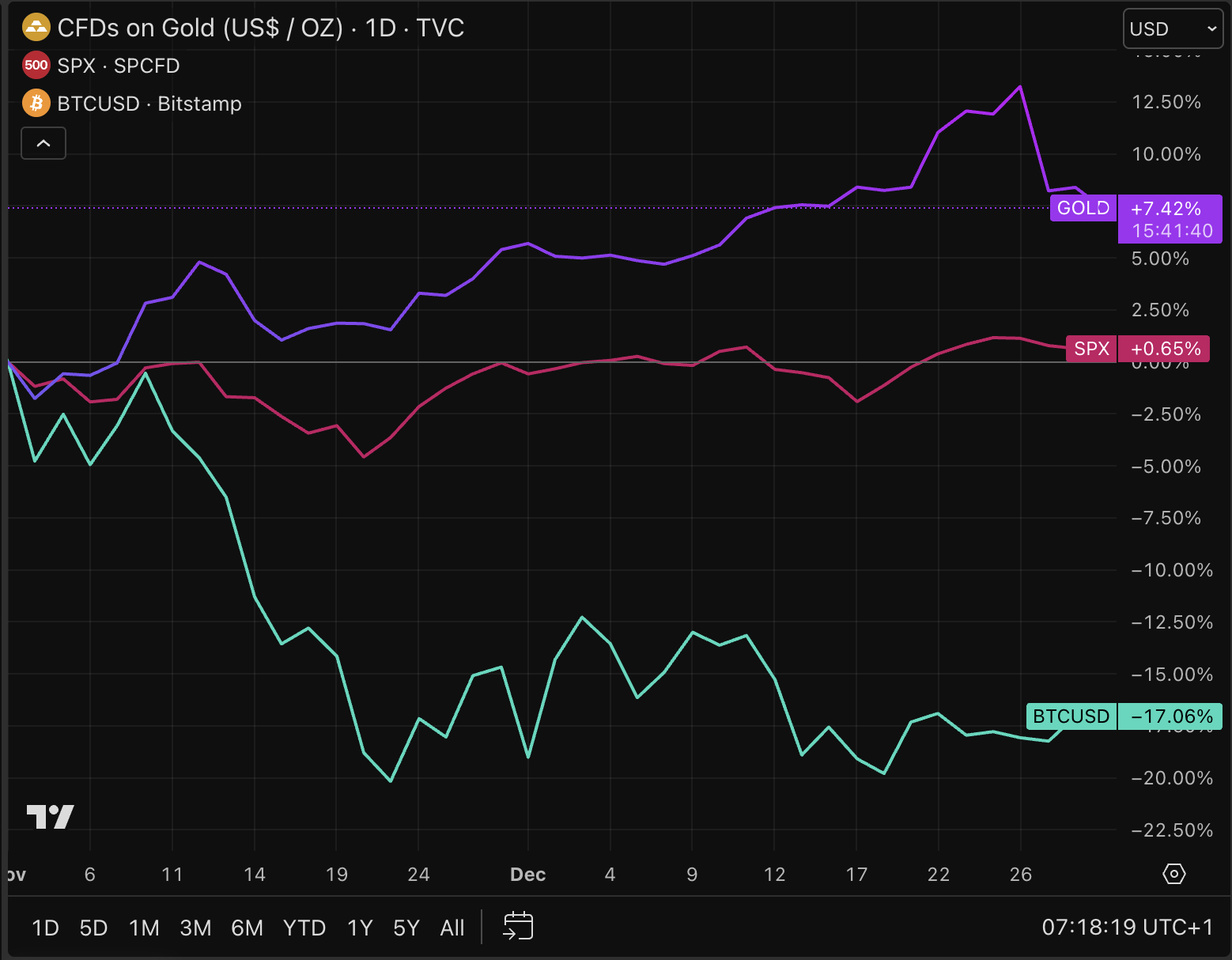 Seit Anfang November entwickeln sich die Leistungen großer Anlageklassen auffallend unterschiedlich. Gold liegt etwa 7 Prozent im Plus, der S&P 500 stieg um rund 1 Prozent, während Bitcoin im selben Zeitraum um etwa 17 Prozent fiel und sich um 88.000 Dollar bewegte. Auf den ersten Blick scheint damit Krypto Richtung Ende 2025 der klare Verlierer zu sein.