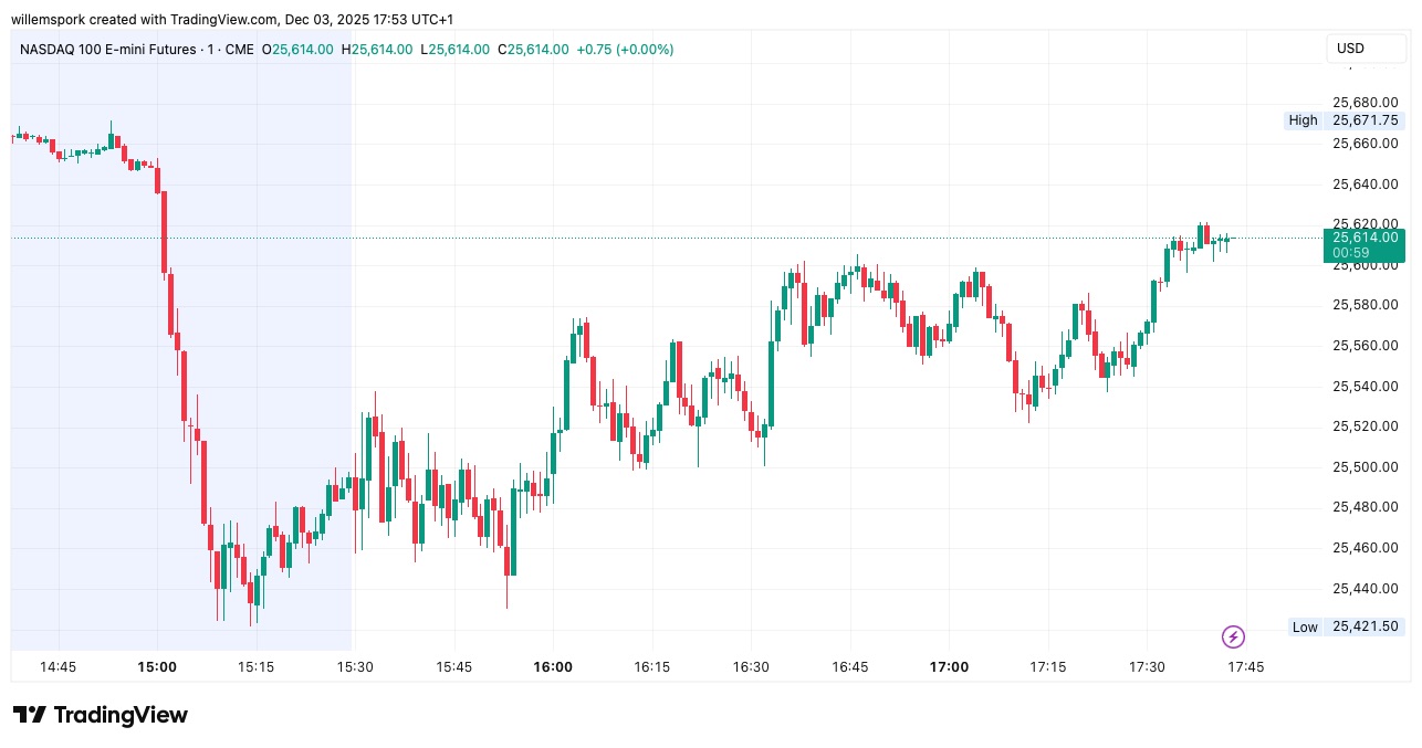 Der Nasdaq-100-Index, in dem die größten US-Techkonzerne vertreten sind, eröffnete mit einem kräftigen Minus von 200 Punkten bei 25.400. Inzwischen zeichnet sich eine Erholung in Richtung 25.620 Punkte ab.