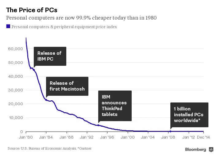 Historisch gesehen ist dies selten der Fall. Wenn die Produktionskosten stark sinken, steigt in der Regel die Nachfrage. Der Preis für PCs ist seit 1980 um mehr als 99 Prozent gesunken, aber anstatt weniger Computer zu verwenden, nutzen wir exponentiell mehr. Auf der Grundlage dieser niedrigeren Kosten entstanden neue Industrien.