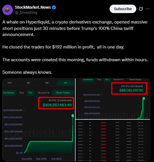 Das Timing war extrem präzise. Die Positionen wurden nur eine halbe Stunde eröffnet, bevor Donald Trump neue Importzölle von 100 Prozent auf chinesische Waren ankündigte. In der Folge rauschte der Markt nach unten. Der Whale schloss auf dem Tiefpunkt des Crashs nahezu alle Positionen und sicherte sich so einen geschätzten Gewinn von 192 Millionen Dollar.