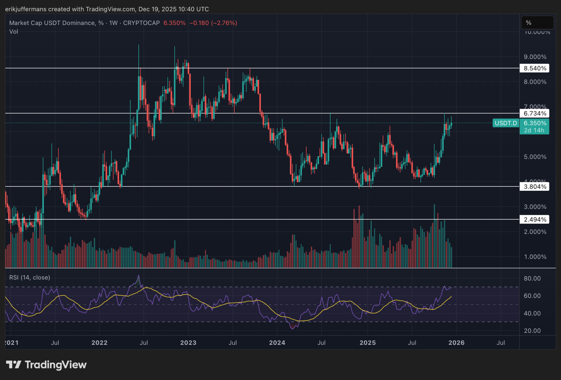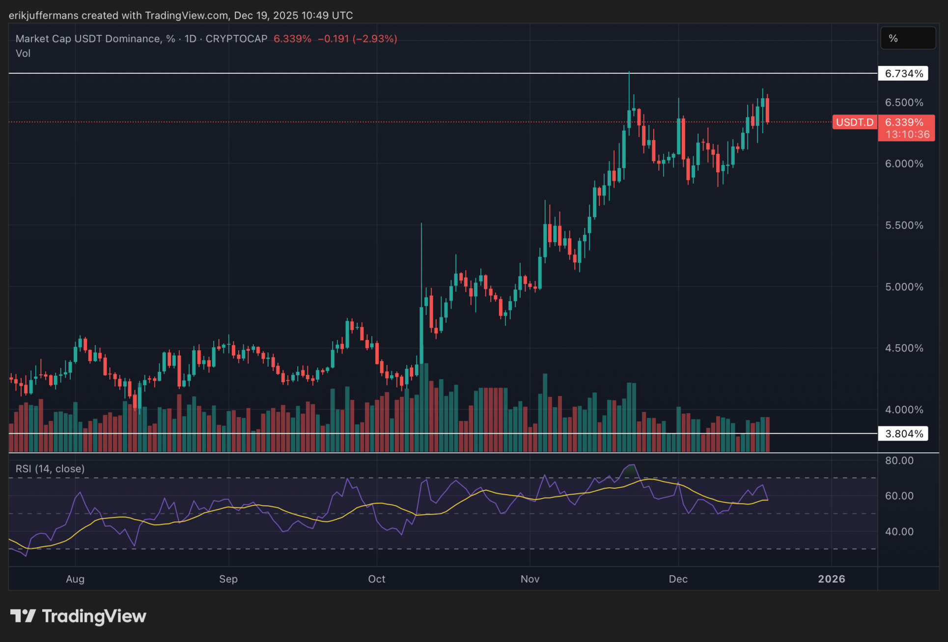 Das USDT.D-Diagramm zeigt einen Prozentsatz, der den Gesamtanteil der USDT-Token am Kryptomarkt repräsentiert. Obwohl es mehrere Stablecoins gibt, ist USDT mit Abstand die größte. Je mehr Händler USDT besitzen, desto weniger Kapital fließt in Bitcoin und Altcoins.