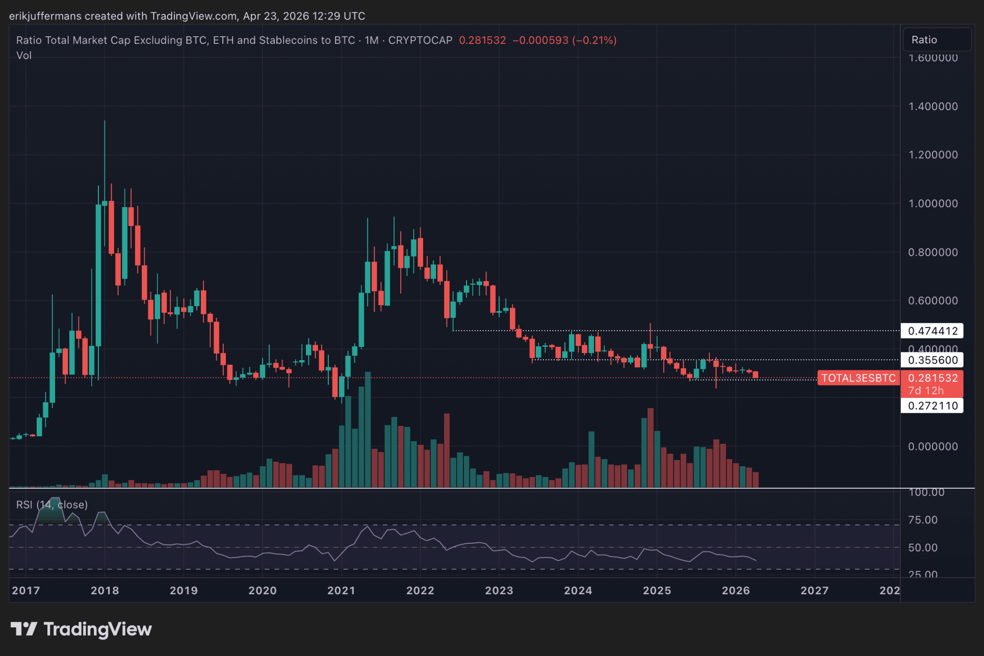 Die Grafik zeigt das Verhältnis des Altcoin-Marktes, ohne ETH und Stablecoins, im Vergleich zu Bitcoin. Seit dem Höchststand im Jahr 2021 gibt es einen klaren Abwärtstrend. Langfristig warten Anleger also schon fünf Jahre auf ein starkes Signal, dass Altcoins wieder besser abschneiden als BTC.
