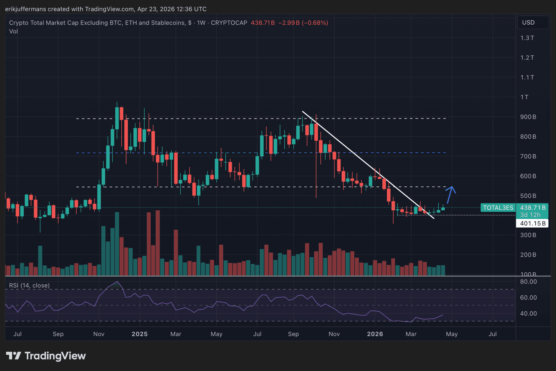 Bedeutet das, dass Altcoins derzeit eine schlechte Investition sind? Keineswegs. Nach Monaten des Rückgangs gibt es Anzeichen dafür, dass Altcoins möglicherweise bereit für eine Erholung sind. Die Grafik unten zeigt die gesamte Marktkapitalisierung der Altcoins, ohne ETH und Stablecoins.