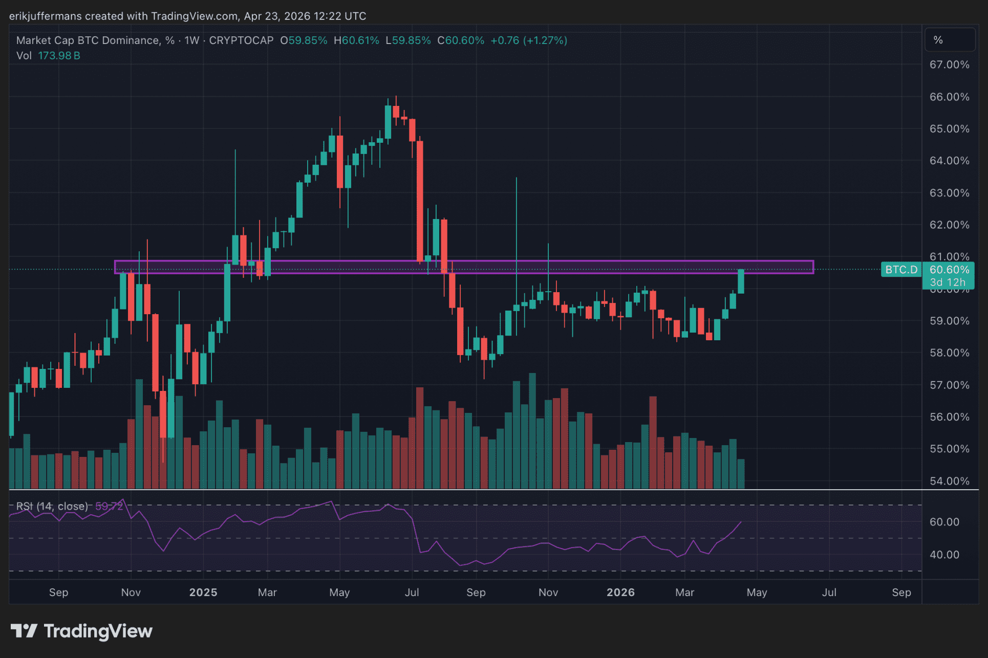 Ein Blick auf die Bitcoin-Dominanz (BTC.D)-Grafik bestätigt dieses Bild. Diese Grafik zeigt, welcher Anteil des gesamten Kryptomarkts aus Bitcoin besteht. In den letzten vier Wochen, insbesondere diese Woche, nimmt diese Dominanz stark zu. Kapital fließt also von Altcoins zu Bitcoin.