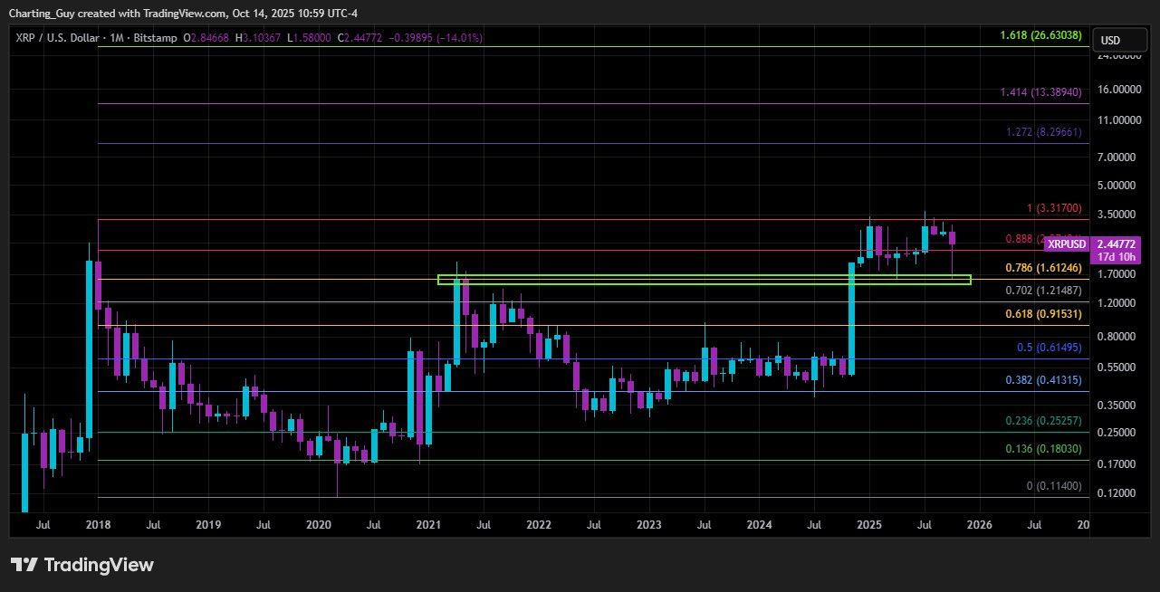 Charting Guy verweist auf den Monatschart von XRP, wo sich der Coin am 0,888-Fibonacci-Niveau bei 2,44 US-Dollar befindet. Seiner Analyse nach liegt zwischen 1,61 und 1,70 US-Dollar eine starke Unterstützungszone – ein Bereich, der bereits während der Rally 2021 gehalten hat. Solange XRP über dieser Zone bleibt, bleibt das technische Bild positiv.
