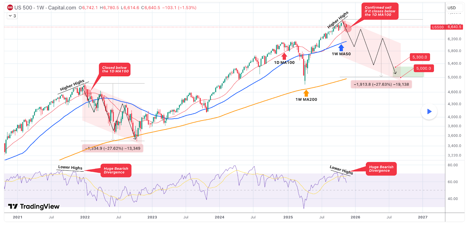 X-Nutzer Brew Markets weist darauf hin, dass der S&P 500 mit einem Minus von 3,26 Prozent auf den schwächsten November seit 2008 zusteuert. Nach Einschätzung von TradingShot gefährdet die schwache Performance auch die nächste kritische Marke: den 100-Wochen-Durchschnitt. Diese Trendlinie fungierte in den vergangenen fünf Monaten als verlässliche Unterstützung – ebenso wie in früheren Phasen des Bullenmarktes.