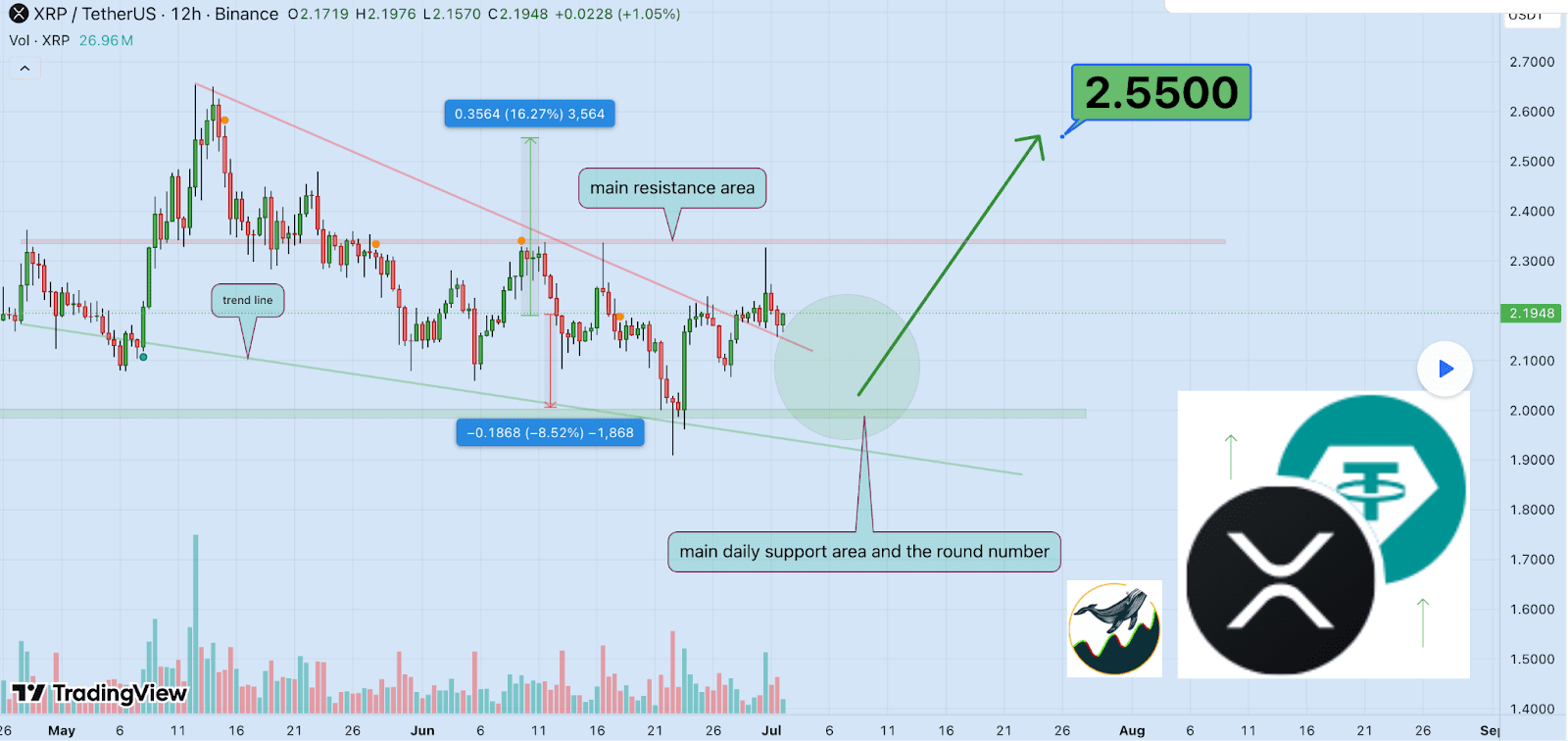 Dennoch sieht ein Krypto-Analyst Potenzial für einen signifikanten Anstieg. Ihm zufolge könnte der XRP-Kurs mittelfristig auf etwa 2,55 Dollar steigen. Dafür müsste jedoch erst eine wichtige technische Hürde überwunden werden.