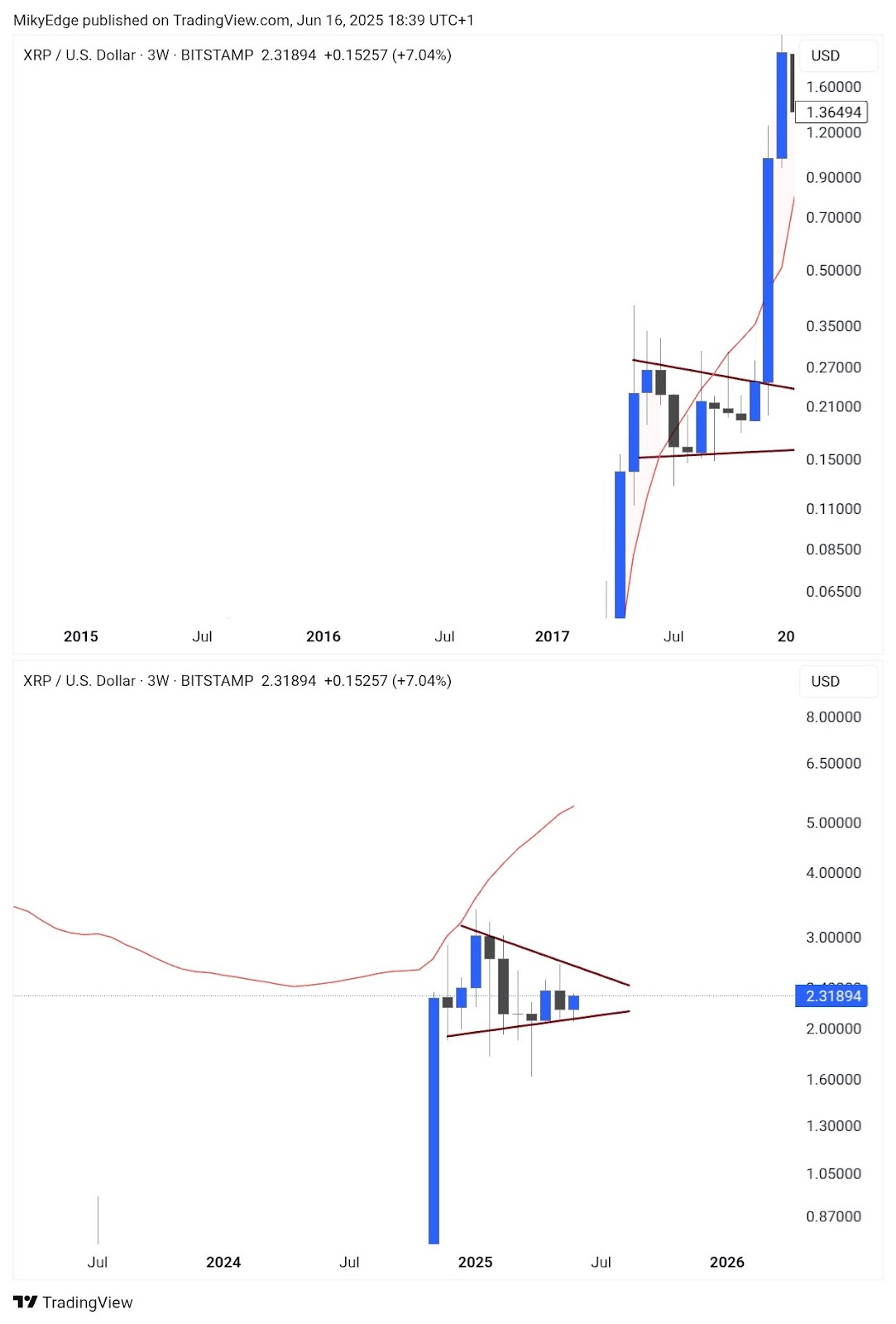 Es handelt sich jedoch um Mikybull Crypto, einen Analysten, der seit Jahren solche Kursprognosen für XRP teilt. Man könnte fast das Gefühl bekommen, dass er von einem starken Anstieg der Währung profitieren würde.