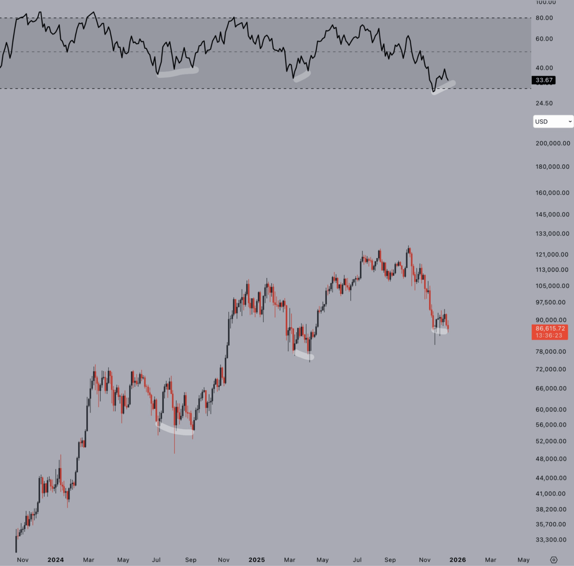 Auch der Makro-Analyst Julien Bittel sieht Parallelen zu früheren Momenten, in denen der RSI von Bitcoin unter 30 gefallen ist. Historisch gesehen folgte darauf häufig eine Erholung, wenn auch selten ohne erhebliche Schwankungen. Laut Bittel erfordert die Bildung eines soliden Bodens Zeit und geht meist mit seitlichen Bewegungen einher.