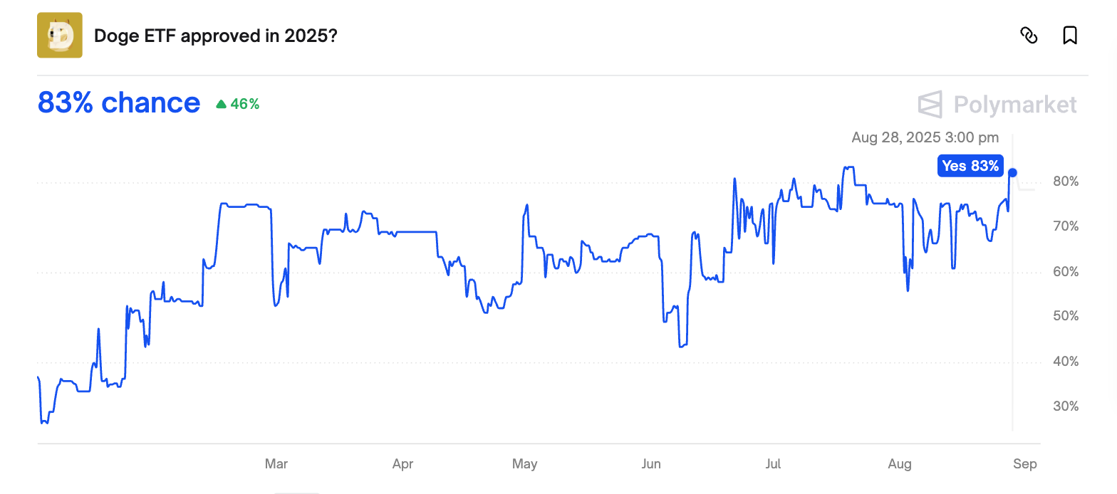 Ein Dogecoin Exchange Traded Product (ETP) ist in Europa bereits genehmigt und laut Marktplatz Polymarket besteht dieses Jahr fast eine 80-prozentige Chance, dass auch in den Vereinigten Staaten ein Fonds zugelassen wird.