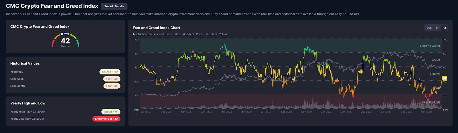 Der Index wird von CoinMarketCap erstellt und zeigt, wie sich die Anleger fühlen. Mit einem Stand um die 40 ist die Panik verschwunden, jedoch wagen es viele noch nicht, mit vollem Vertrauen zu investieren.