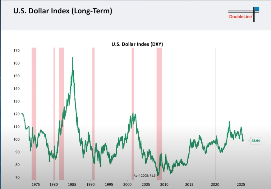 Nach Gundlach befindet sich der Dollarindex (DXY) bereits seit Jahren in einem Abwärtstrend und droht eine „echte Baisse“ einzuleiten, wenn eine wichtige Unterstützungslinie durchbrochen wird.
