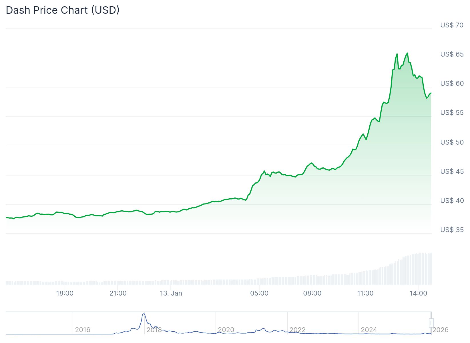 Innerhalb von knapp 48 Stunden ist der Dash-Kurs von etwas unter 37 Dollar auf einen Höchststand von 70 Dollar gestiegen. Zum Zeitpunkt des Schreibens liegt der DASH-Kurs bei etwa 60 Dollar, was immer noch einem Anstieg von fast 60 Prozent innerhalb von 24 Stunden entspricht.