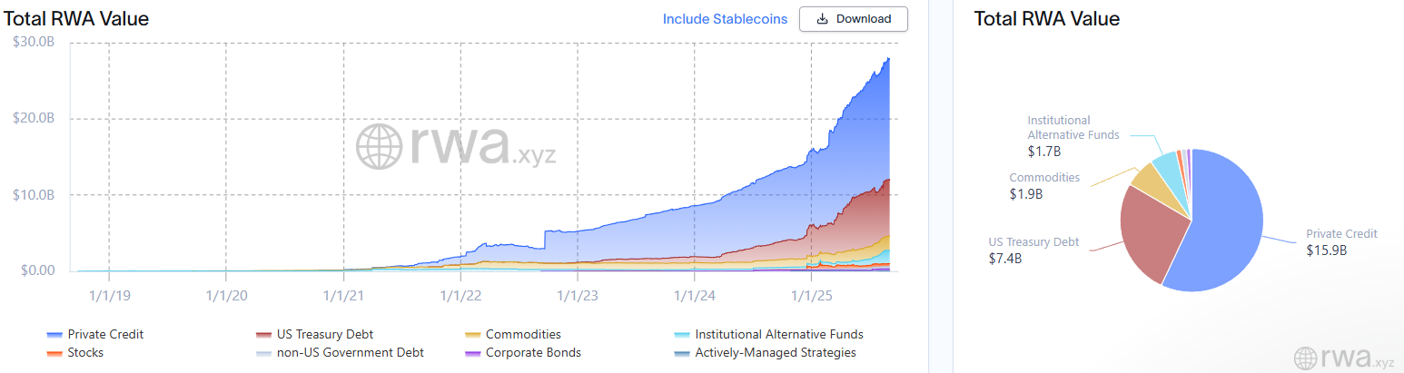 Weltweit sind mittlerweile 27,8 Milliarden Dollar an tokenisierten Vermögenswerten auf der Blockchain. Es handelt sich vor allem um private Kredite, die 15,9 Milliarden Dollar ausmachen, gefolgt von US-Staatsanleihen im Wert von 7,4 Milliarden Dollar.