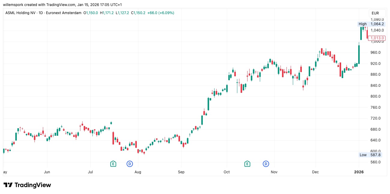 Der Kurs von ASML stieg am Donnerstag um mehr als fünf Prozent nach besser als erwarteten Zahlen von TSMC, dem weltweit größten Chiphersteller. Das taiwanesische Unternehmen, einer der größten Kunden von ASML, erhöhte seine Kapitalinvestitionen für 2026 auf bis zu 56 Milliarden Dollar. Damit zeigt es, dass es voll auf die steigende Nachfrage nach Chips für Künstliche Intelligenz setzt.