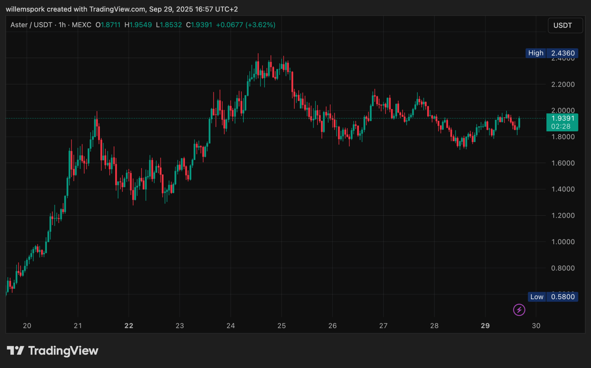 Die Aufmerksamkeit für Aster kommt zu einem Zeitpunkt, an dem der Token bereits starke Kursbewegungen gezeigt hat. Seit der Einführung ist ASTER gegenüber dem Ausgabekurs um mehr als 7.000 Prozent gestiegen. Am 24. September erreichte ASTER ein Hoch von 2,41 US-Dollar. Derzeit notiert der Token bei rund 1,90 US-Dollar.