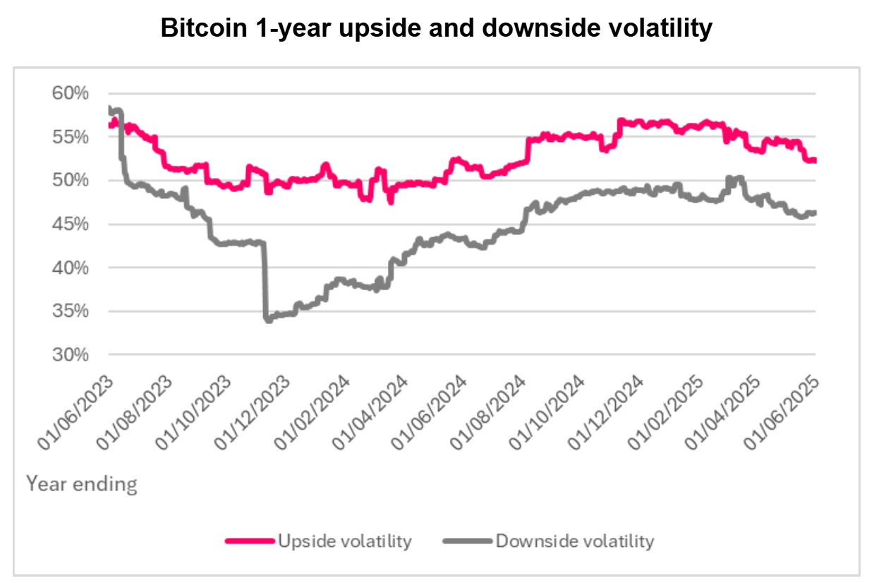 Darüber hinaus weisen sie bei Sygnum auf das verbesserte Volatilitätsprofil von Bitcoin hin. Über die letzten drei Jahre war die aufwärts gerichtete Volatilität größer als die abwärts gerichtete Volatilität.