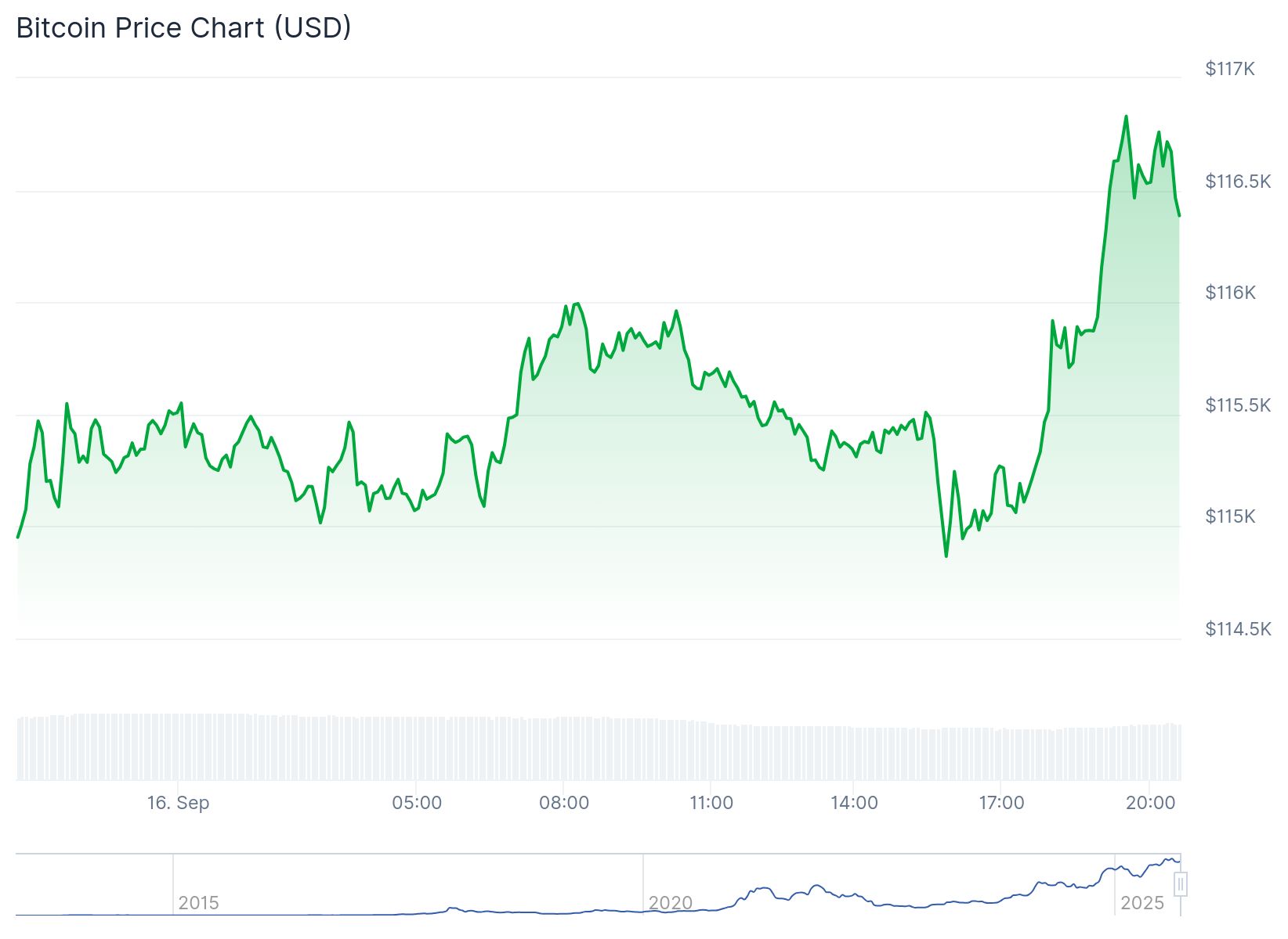 Bitcoin hat in wenigen Stunden 1,5 Prozent an Wert gewonnen. Um 17:30 Uhr stand der Bitcoin-Kurs noch bei 115.000 Dollar, aber mittlerweile zeigt sich ein glänzender Kurs von 116.800 Dollar auf den Anzeigetafeln. Seit dem 23. August hat der Kurs nicht mehr so hoch gestanden.