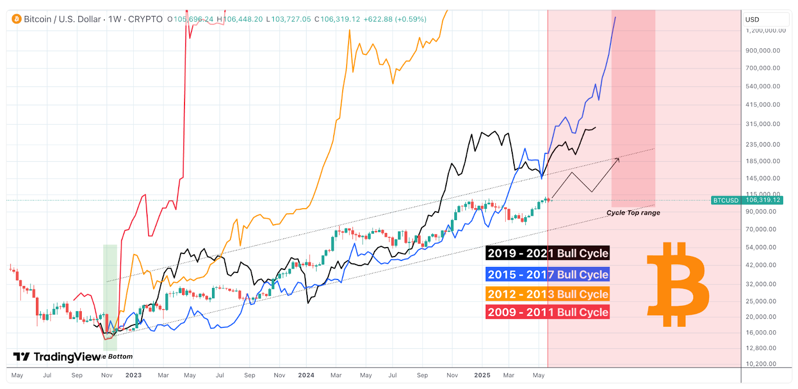 Sollte BTC tatsächlich auf 120.000 Dollar steigen, würde das einen erheblichen Anstieg von 13,8% im Vergleich zum aktuellen Preis von 105.500 Dollar bedeuten. Darüber hinaus bleibt der Analyst auch optimistisch hinsichtlich der langfristigen Aussichten. So könnte die digitale Währung bis Ende dieses Jahres in Richtung 200.000 Dollar gehen, vorausgesetzt, das historische Muster setzt sich fort.