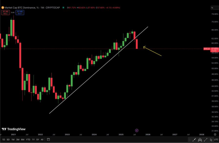 Bitcoins Anteil am Gesamtmarktwert von Krypto fiel gestern auf 57,69 Prozent. Das bedeutet einen Verlust von fast 8 Prozent im Vergleich zu Anfang August, als der Anteil noch über 62 Prozent lag. Damit ist der mehrjährige Aufwärtstrend, der Mitte 2022 begann, durchbrochen.