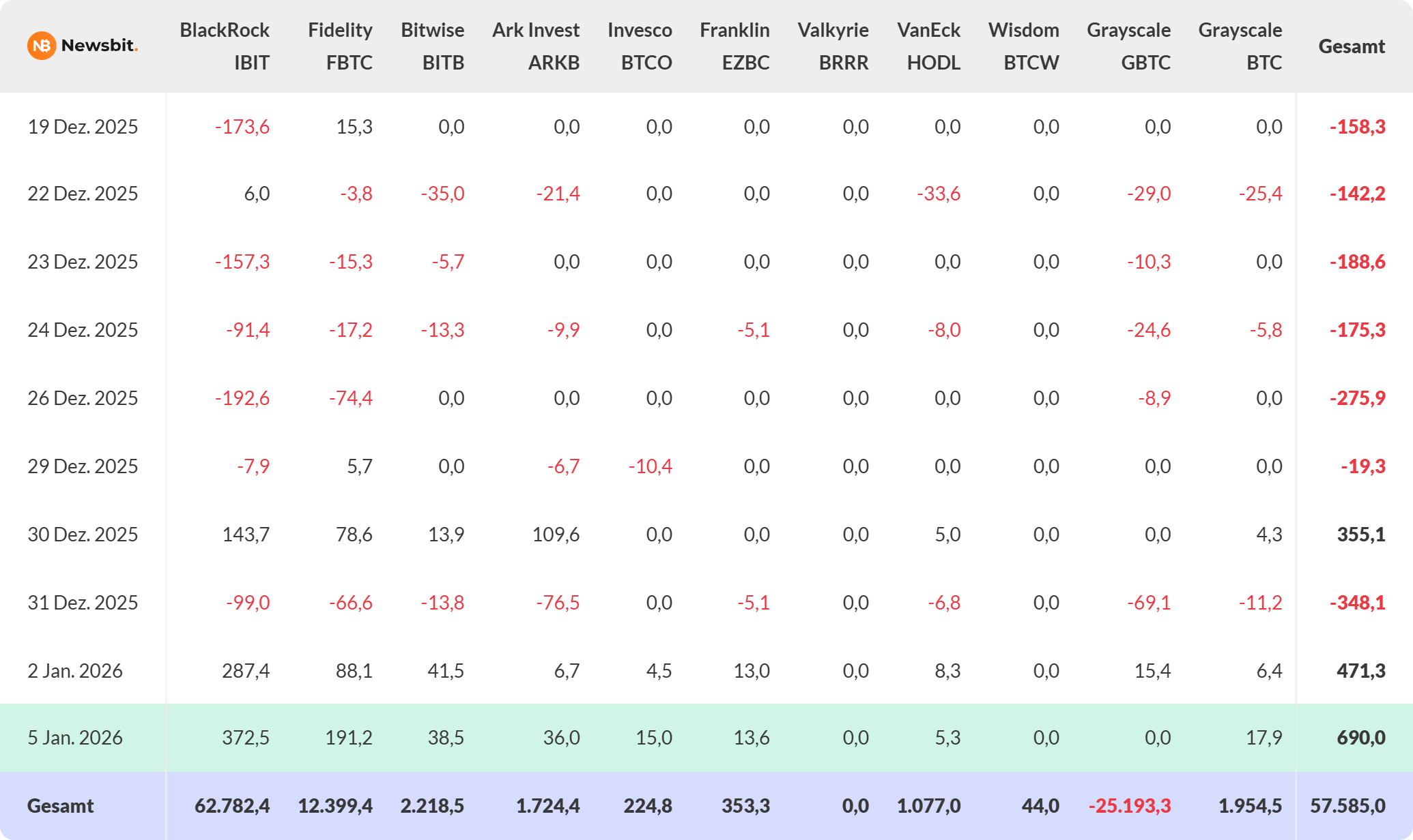 Damit wird ein erheblicher Teil der Verluste aus November (3,48 Milliarden Dollar) und Dezember (1,08 Milliarden Dollar) ausgeglichen, als das Marktsentiment noch überwiegend negativ war. Das zeigen Daten von SoSoValue.