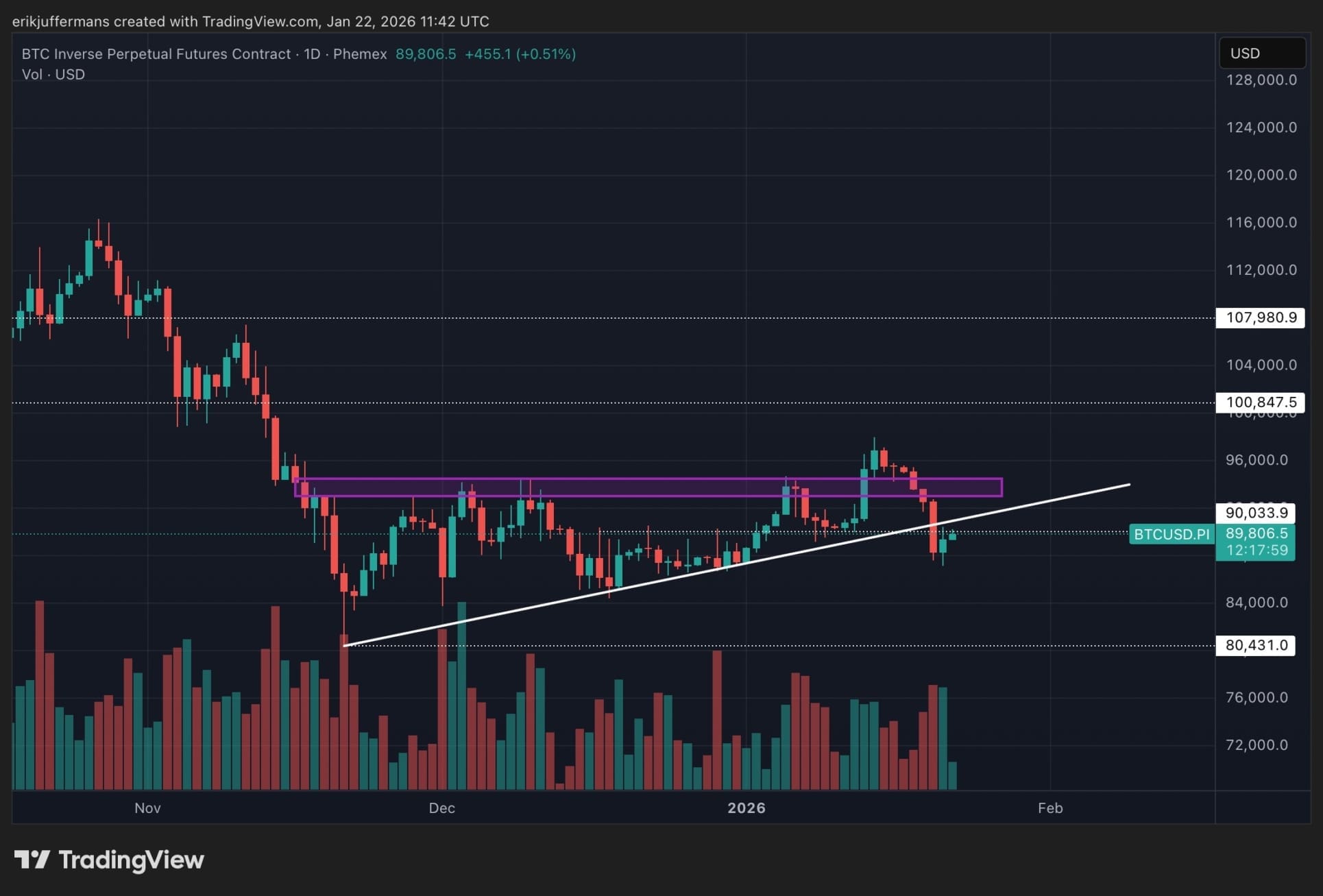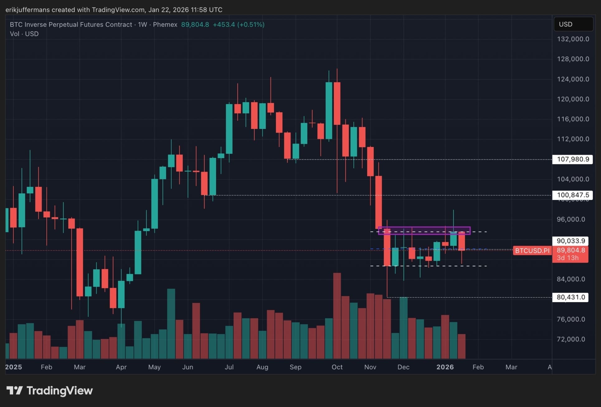 Diese beiden Niveaus sind keineswegs zufällig. Der BTC-Kurs eröffnete 2025 bei 93.500 Dollar. Der Eröffnungskurs am 1. Januar 2026 lag bei 86.500 Dollar. Seit November schwankt der Kurs bereits in dieser Spanne, und es bleibt abzuwarten, ob er nach oben oder unten ausbricht.