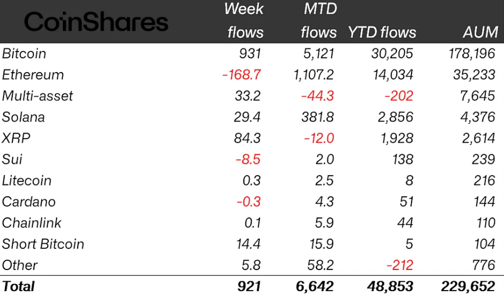 Laut einem neuen Bericht des Vermögensverwalters CoinShares flossen in der vergangenen Woche 921 Millionen US-Dollar an neuem Kapital in Krypto-Fonds.