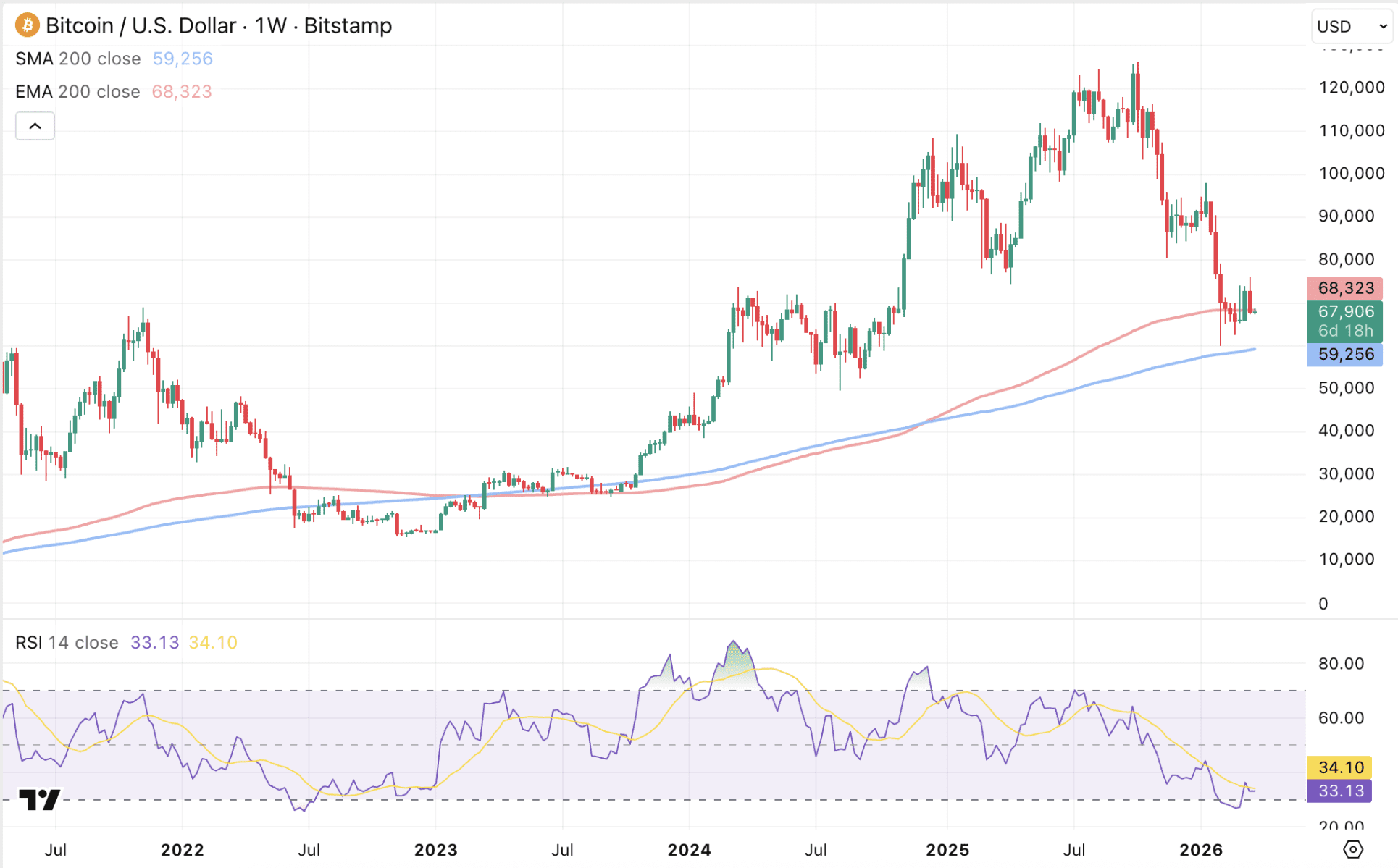 Derzeit scheint Bitcoin Schwierigkeiten zu haben, sich zu behaupten. Das hängt natürlich mit dem Iran-Krieg zusammen. Diese Marke ist relevant, da hier nicht nur der 200-Wochen exponentielle Kursdurchschnitt liegt, sondern auch das Allzeithoch der Bullmarkt-Rally von 2021 erreicht wurde.