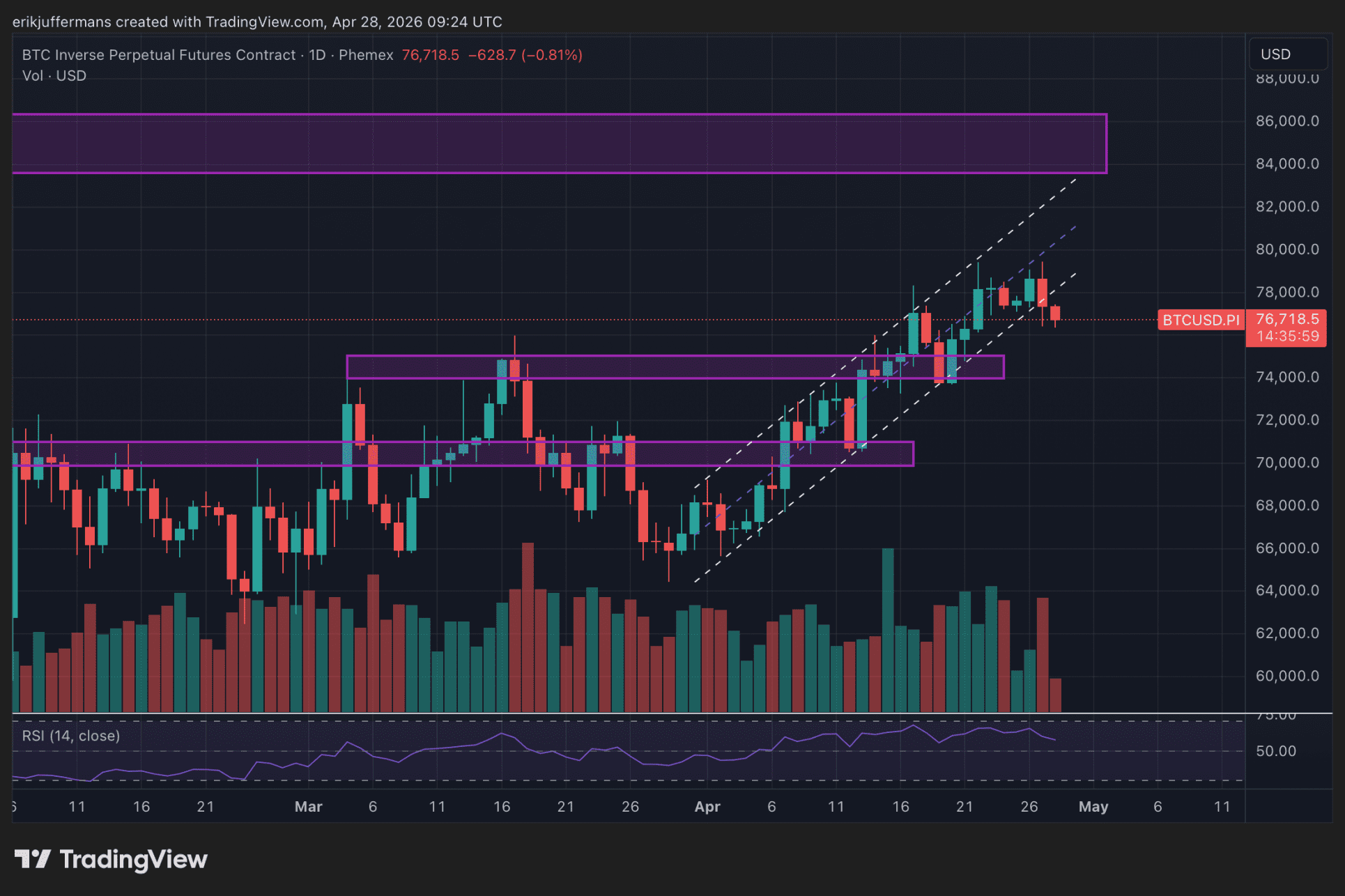 Gestern stieg der Kurs erneut auf den jüngsten Höchststand von 79.500 Dollar, konnte diesen jedoch nicht durchbrechen. Anschließend fiel der Kurs stark ab und verließ den Aufwärtskanal. Es hat sich somit eine Doppelspitze gebildet, ein bearishes Muster. Der Kurs sucht nun offenbar nach Unterstützung.