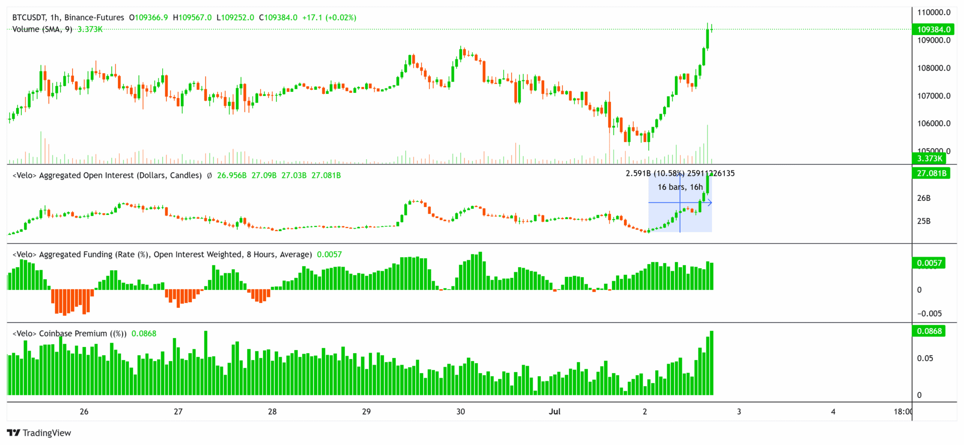 Bitcoin konnte gestern und letzte Nacht über 109.000 Dollar steigen, während die weltweite Geldmenge neue Rekorde erreicht. Dabei steigt das Open Interest auf dem Futuresmarkt, es gibt eine starke Coinbase Premium und stabile Funding Rate.