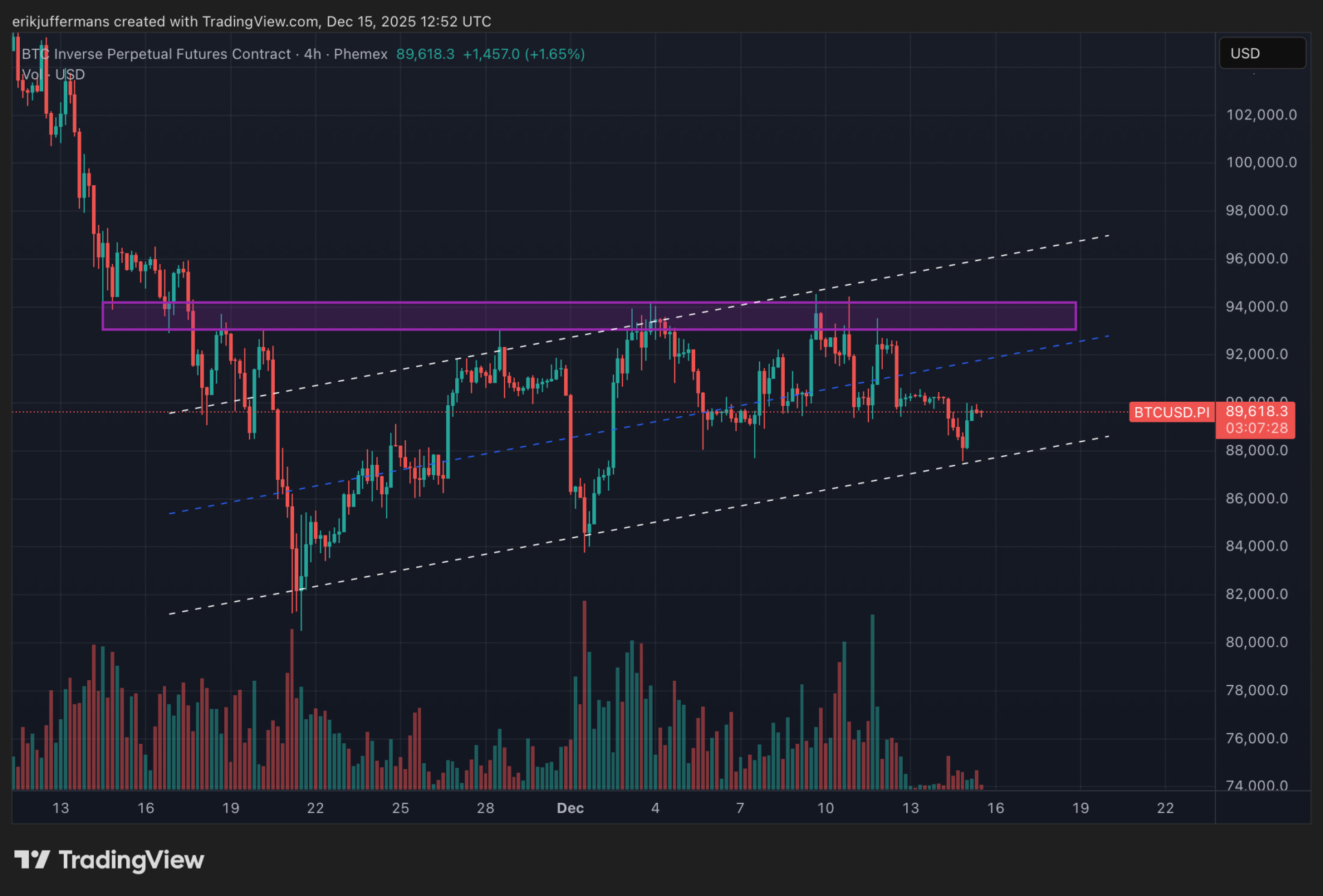 Auf dem Vier-Stunden-Chart von Bitcoin ist erkennbar, dass der Kurs seit fast einem Monat in einem klaren Kanal handelt. Innerhalb dieses Kanals gibt es bei etwa 93.000 Dollar einen starken Widerstand. Hier wurde der Kurs bereits mehrfach zurückgewiesen.