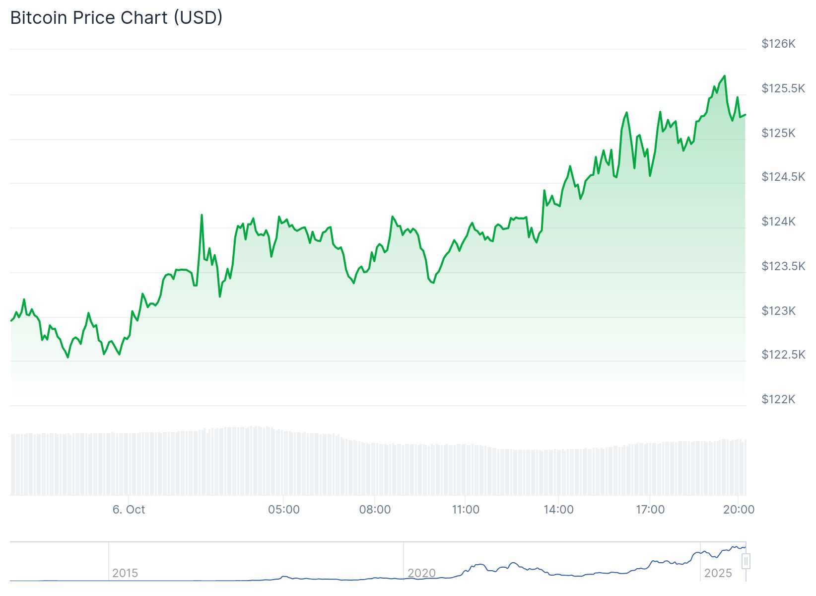 Zum Zeitpunkt des Schreibens steht der Bitcoin Kurs bei 125.402 US-Dollar, 1,86 Prozent höher als vor 24 Stunden.