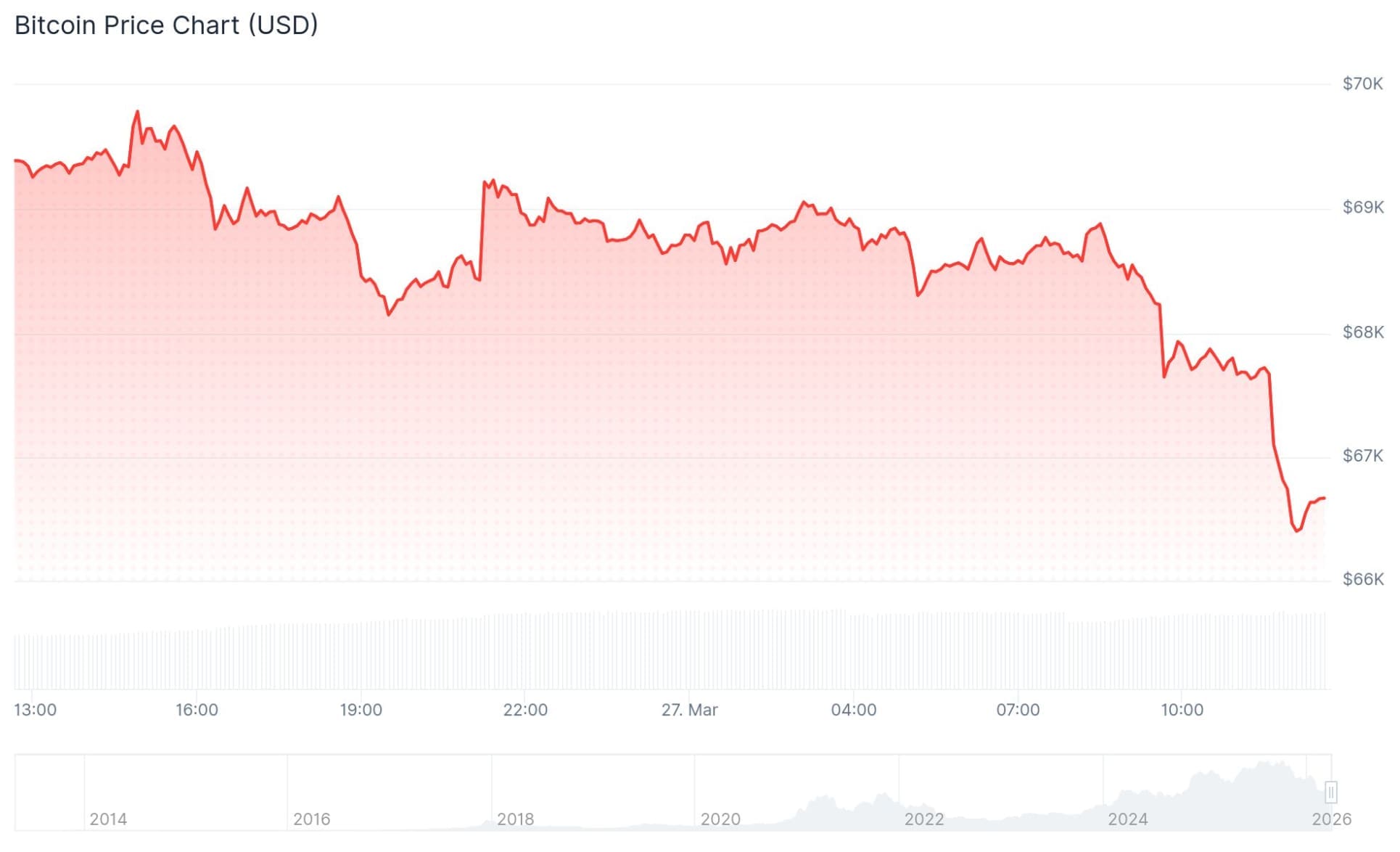 Der Bitcoin-Kurs verzeichnet heute bereits einen Rückgang von fast 3,5 Prozent. Heute Morgen um etwa 08:30 Uhr lag der Preis noch bei fast 69.000 Dollar, mittlerweile wird er für rund 66.500 Dollar gehandelt.