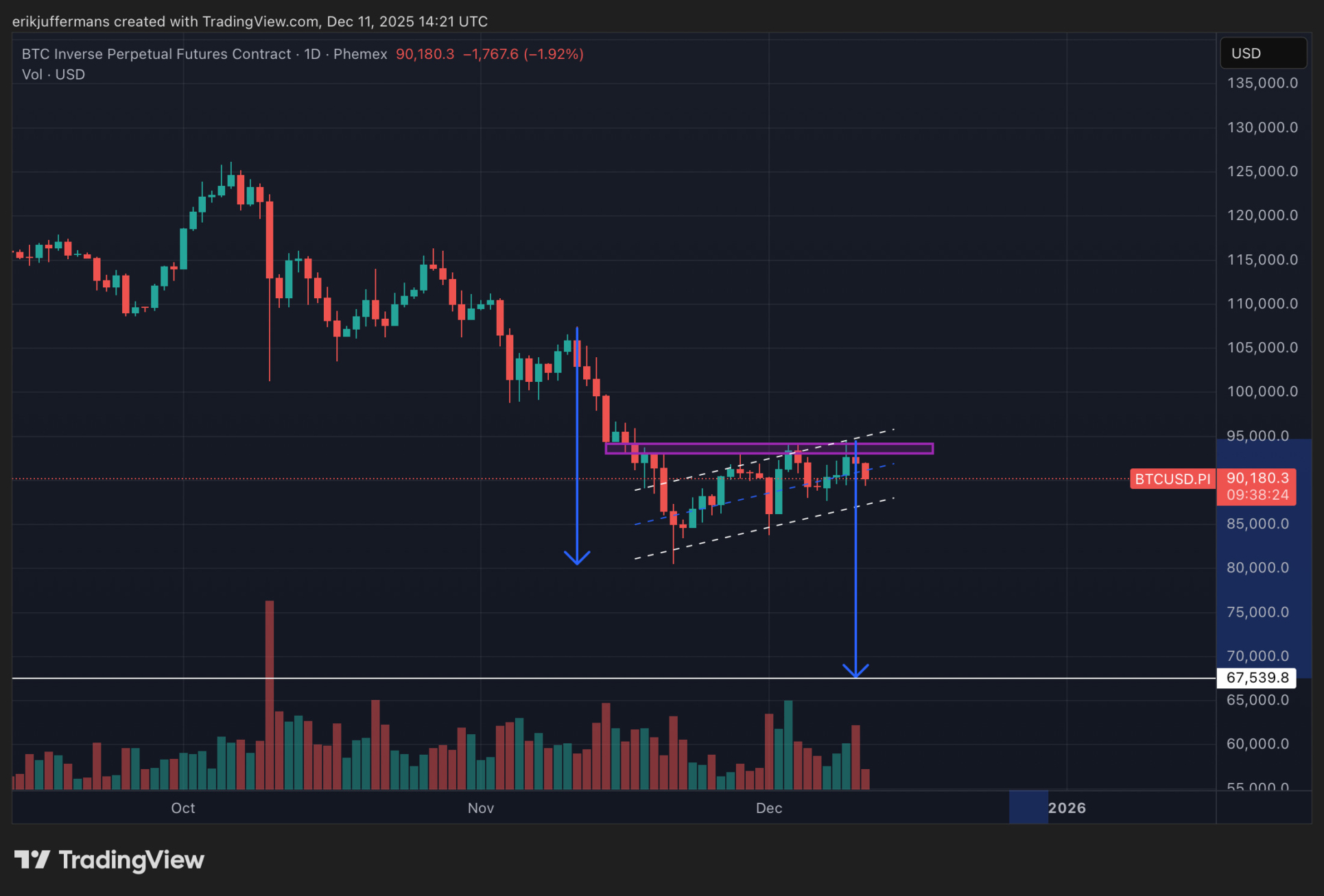 In der kommenden Woche wird sich zeigen, in welche Richtung sich der Bitcoin-Kurs entwickeln möchte. Auch wenn eine Weihnachtsrallye sicherlich noch eine realistische Möglichkeit ist, sollten wir ein bärisches Szenario im Hinterkopf behalten. Sollte die aktuelle Bärenflagge zu einer weiteren Korrektur führen, liegt das technische Ziel bei 68.000 Dollar, in der Nähe des Hochs des letzten Zyklus.