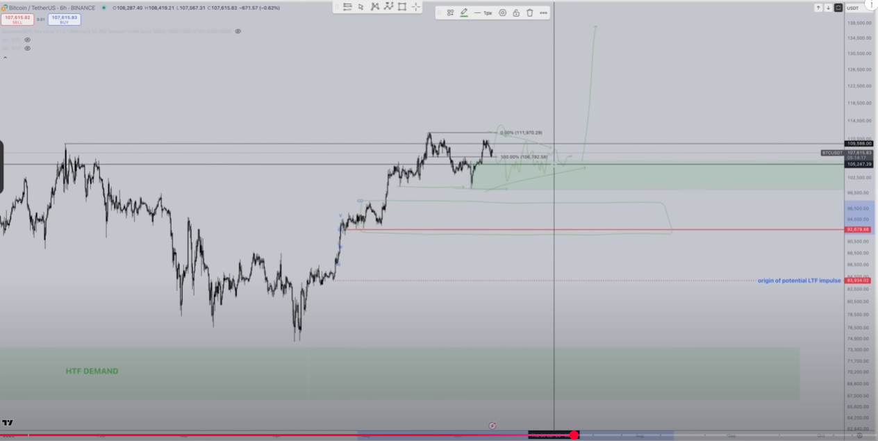 „Im optimistischsten Szenario… würde diese grüne Zone ($100.000 bis $105.000) halten, woraufhin wir eine immer engere Konsolidierung bilden würden und anschließend in einen neuen Impuls nach oben schießen…