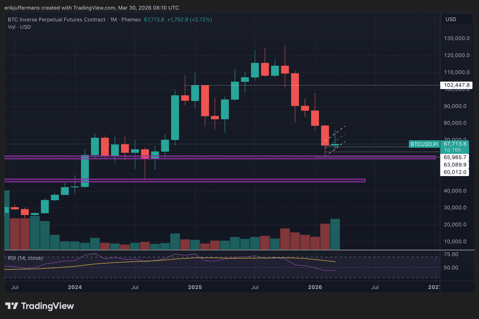 Auf kürzere Sicht sind einige Niveaus interessant. Natürlich die Zone von 66.000 Dollar, die sich bislang stark hält. Sollte der Kurs diese Unterstützung verlieren, schauen wir auf 63.000 Dollar und 60.000 Dollar. Letzteres Niveau ist die entscheidende Linie für Bitcoin.