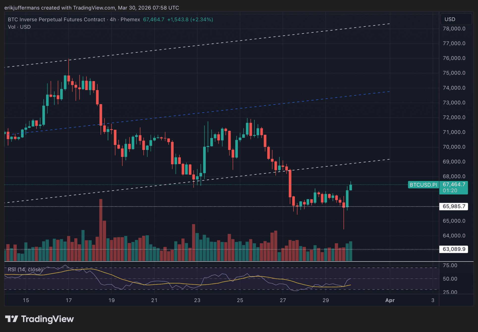 Auf dem untenstehenden Chart ist zu erkennen, dass sich der Kurs heute wieder etwas erholt. Nachdem der Kurs Anfang der Woche aus einem monatelangen Muster ausbrach, fand er Unterstützung bei rund 66.000 Dollar und steigt heute in Richtung etwa 67.500 Dollar.