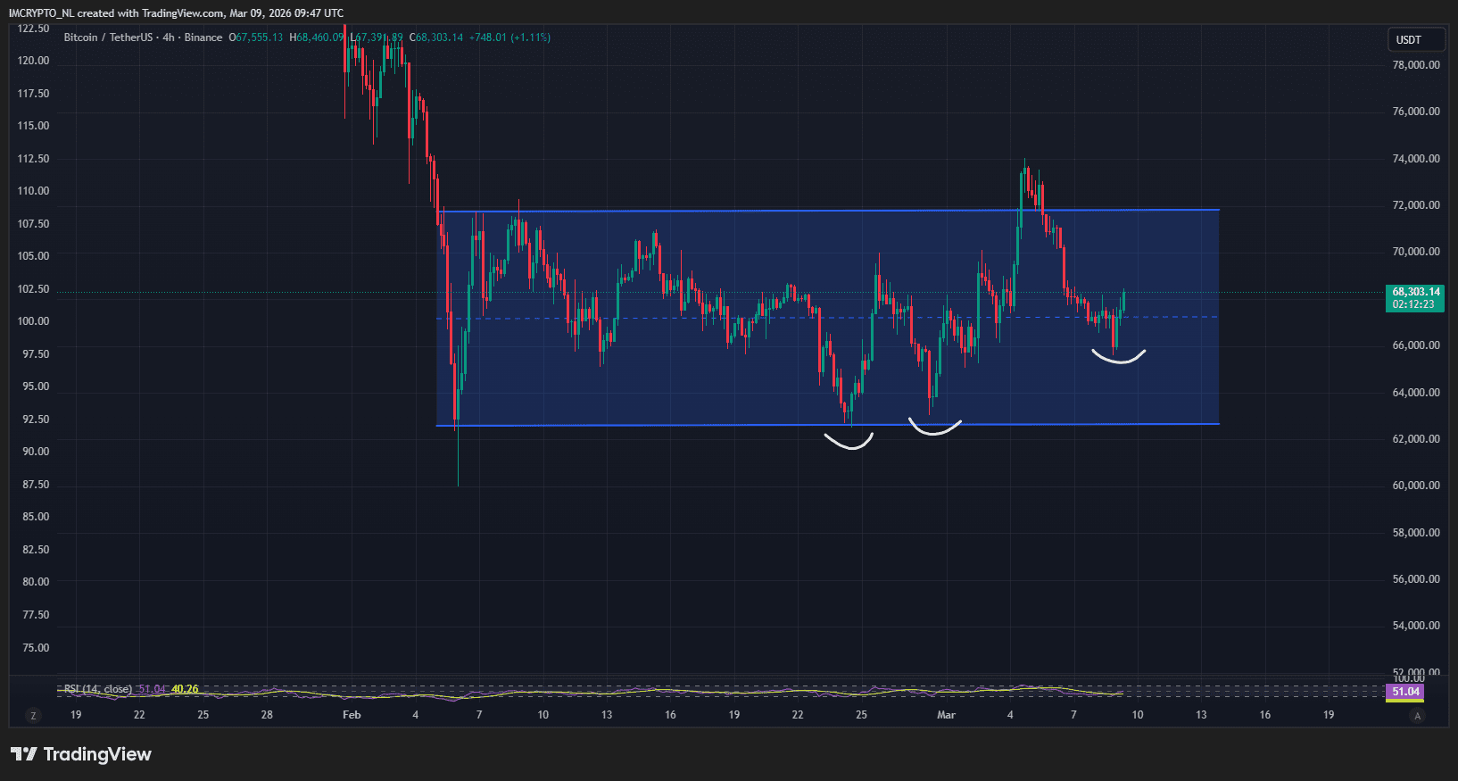Auf dem Vier-Stunden-Chart sehen wir, dass Bitcoin zum dritten Mal ein höheres Tief erreicht hat, was auf einen Aufwärtstrend hindeutet. Der Kurs könnte nun weiter ansteigen zur oberen Begrenzung des Kanals bei etwa 71.800 Dollar. Idealerweise sollte dann auch das Hoch der letzten Woche von 74.050 Dollar übertroffen werden. Davon sind wir derzeit jedoch noch ein gutes Stück entfernt.