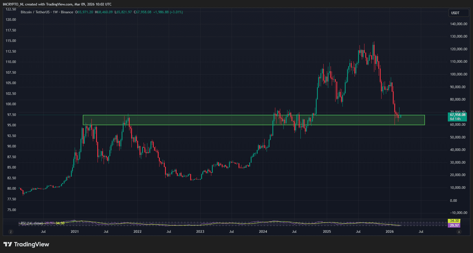 Werfen wir einen genaueren Blick, so können wir zumindest feststellen, dass sich Bitcoin derzeit an einem interessanten Punkt befindet. 2021 endete hier der Bullenmarkt, und 2024 hat der Kurs hier bereits mehr als acht Monate seitwärts tendiert.