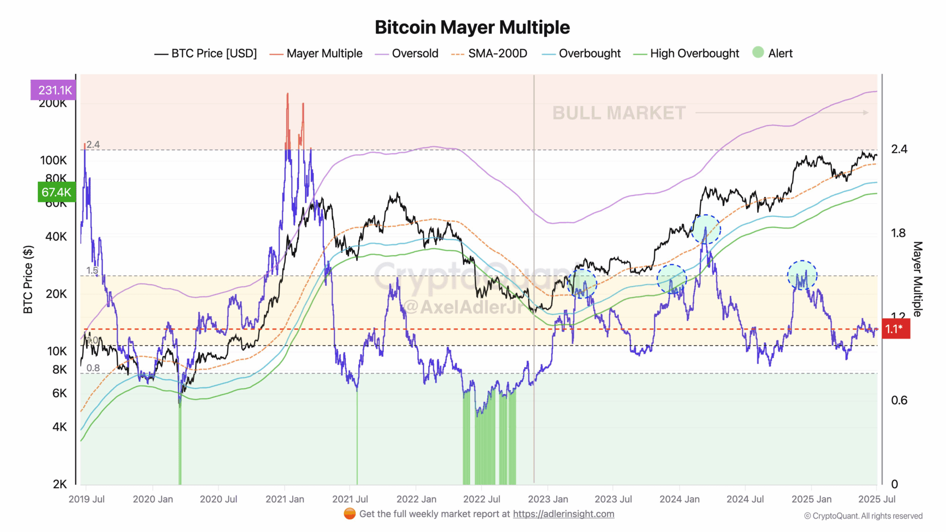 Der bekannte Analyst Axel Adler bezieht sich auf den Mayer Multiple. Und daraus geht hervor, dass Bitcoin bei einem Kurs von 108.000 Dollar, trotz der Steigerungen im letzten Jahr, immer noch unterbewertet ist. Dieser Indikator vergleicht den aktuellen BTC-Kurs mit dem 200-Tage-Durchschnitt. Das Verhältnis liegt derzeit bei 1,1x. Dies befindet sich in der neutralen Zone von 0,8 bis 1,5x. Erst über 1,5x spricht man von Überhitzung oder Überbewertung.