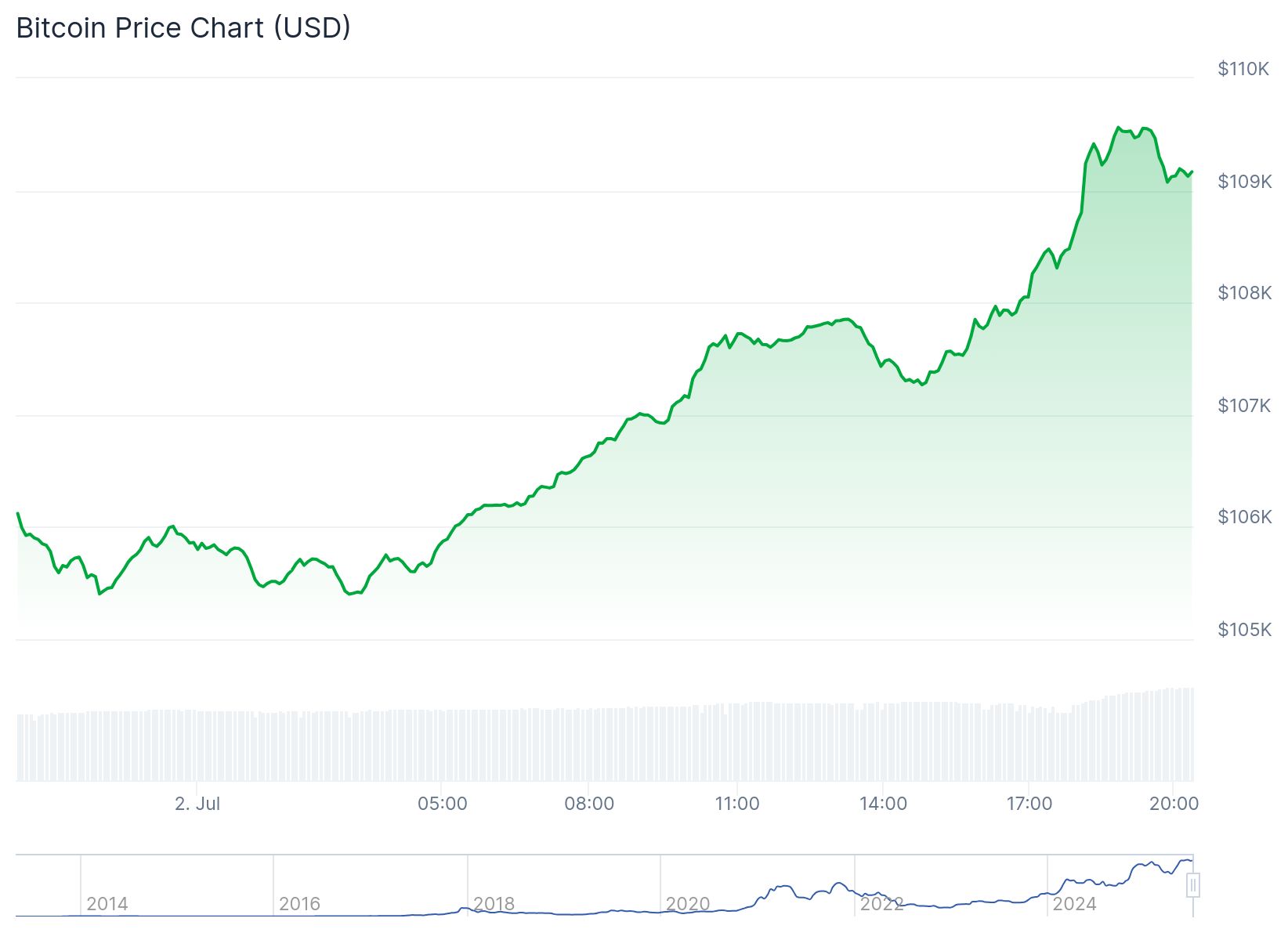 Zum ersten Mal seit dem 11. Juni erscheint wieder ein Bitcoin Kurs von mehr als 109.000 Dollar auf den Anzeigetafeln. Endlich scheinen die Verkäufer um 108.000 Dollar ausgeschaltet zu sein.