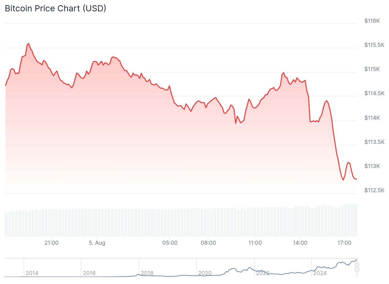 Um 14:00 Uhr wurden noch etwa 115.000 Dollar pro Bitcoin gezahlt, aber inzwischen liegt der Preis etwa 2 Prozent niedriger. Nach 16:00 Uhr fand der größte Rückgang statt.