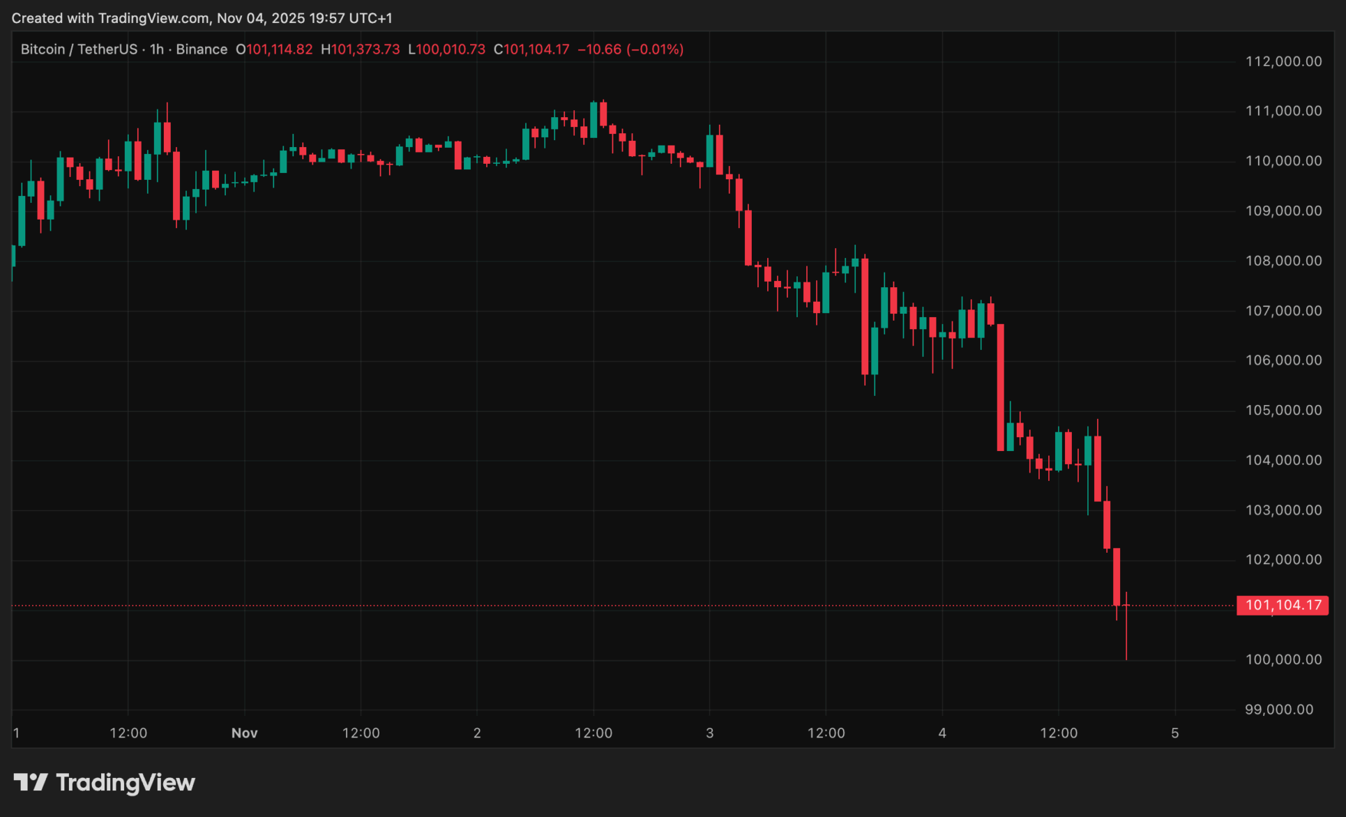 Der BTC-Kurs tauchte kurzzeitig auf 99.913 US-Dollar ab, erholte sich aber leicht auf 101.000 US-Dollar zum Zeitpunkt des Schreibens. Der Rückgang von mehr als fünf Prozent folgte, nachdem die Unterstützung um 104.000 US-Dollar durchbrochen wurde, was unter Händlern die Furcht vor weiteren Verlusten schürte.