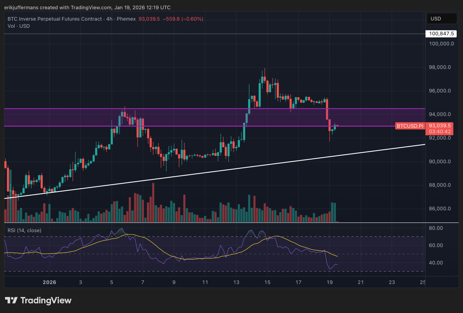 Auf dem 4-Stunden-Chart ist der jüngste Rückgang deutlich zu erkennen. Der Kurs fiel zurück in die Widerstandszone, die letzte Woche endlich durchbrochen wurde. Mittlerweile scheint sich der Kurs bei etwa 93.000 Dollar zu stabilisieren.