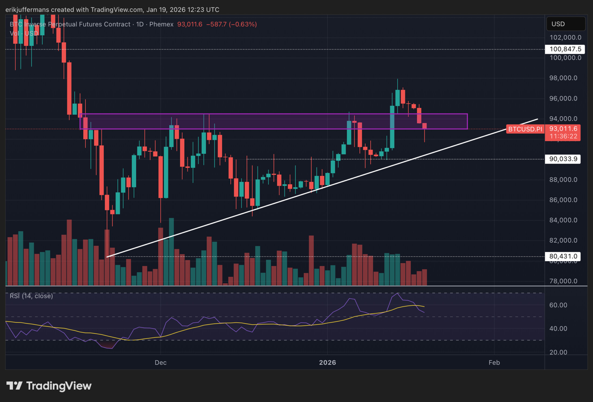 Auch auf dem Tageschart ist die zuvor erwähnte intakte Struktur deutlich sichtbar. Insgesamt ist die aktuelle Korrektur daher recht gesund. Allerdings ist das Niveau von 90.000 Dollar wichtig zu beobachten. Ein Rückgang darunter würde ein tieferes Tief bedeuten und könnte zu einem bärischen Szenario führen.