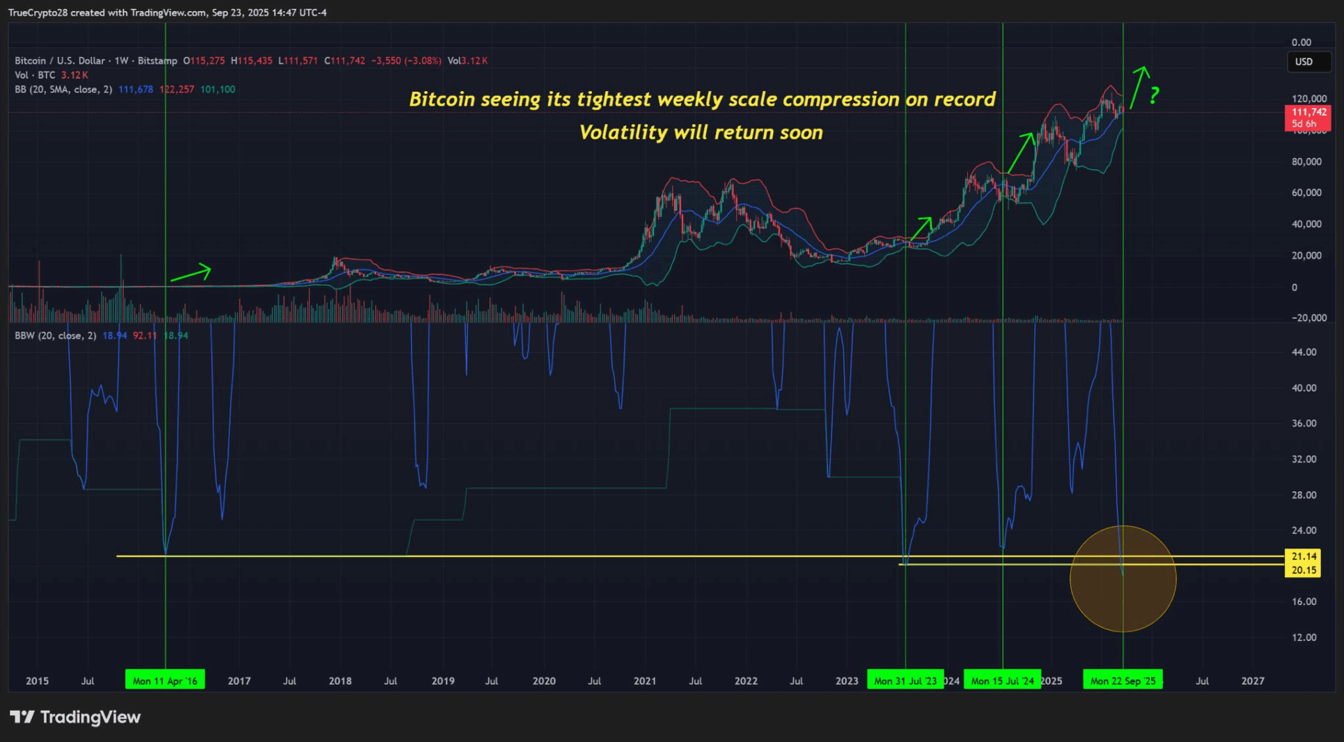 Auf X schrieb der bekannte Analyst Mr. Anderson, dass die wöchentlichen Bollinger Bänder für Bitcoin „nun die engsten jemals sind“. Dieser Indikator besteht aus zwei Linien um das Kursdiagramm, die anzeigen, wie stark der Kurs schwankt. Je näher die Linien beieinander liegen, desto geringer ist die Volatilität. „Wenn die Volatilität so stark komprimiert wird, folgt immer eine Expansion. Sobald diese beginnt, testet der Kurs oft schnell die äußeren Bänder“, so Anderson.