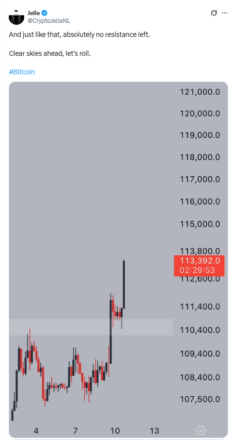 Bitcoin befindet sich jetzt offiziell in der Preisfindung: Es gibt keine früheren Spitzen oder Widerstandsniveaus mehr zu berücksichtigen. „Klare Luft vor uns, auf geht’s,“ so schreibt der niederländische Analyst Jelle.