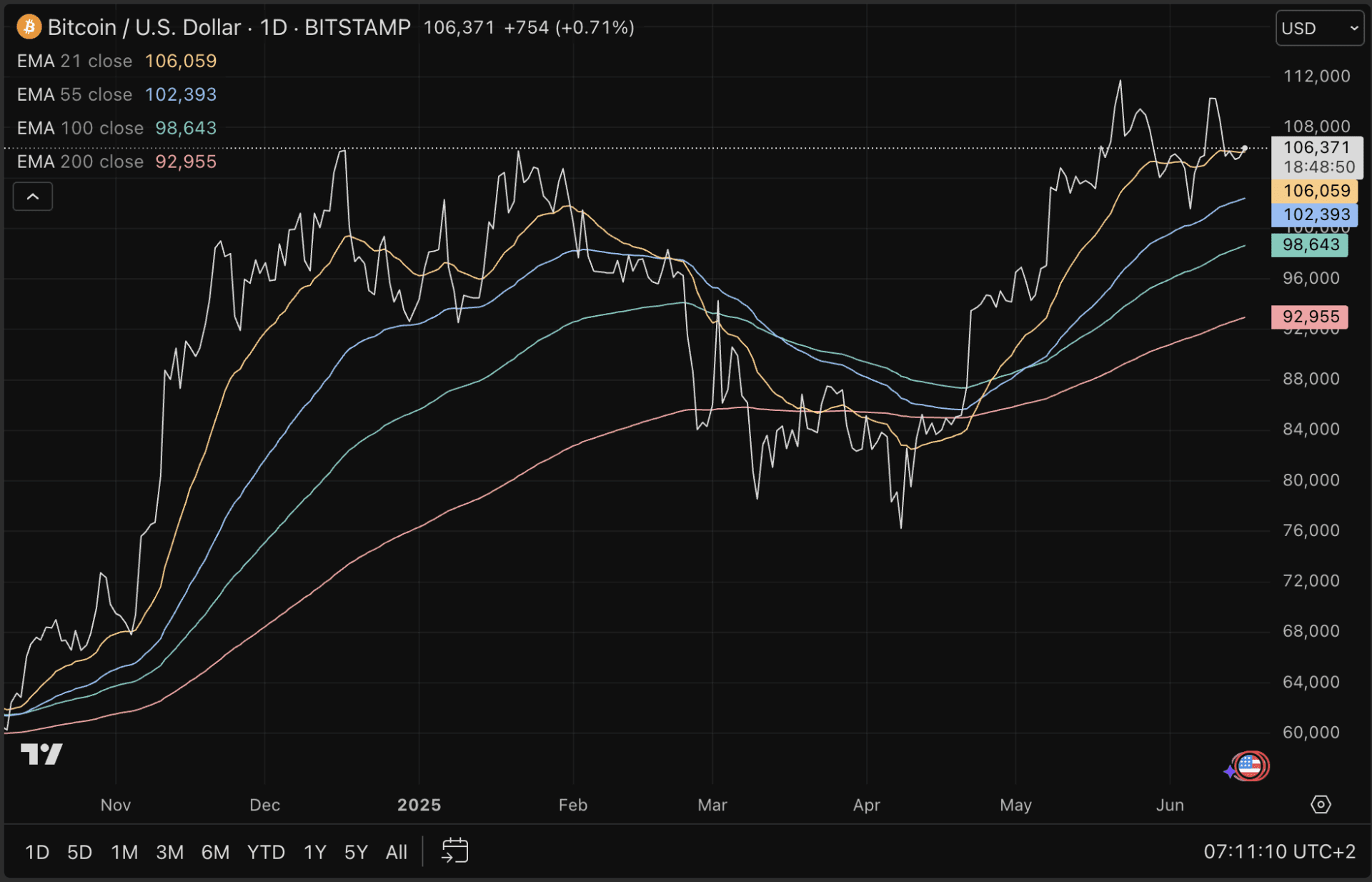 Die Diagramme von Bitcoin sprechen weiterhin für einen Bullenlauf. Im Diagramm unten sehen wir, dass Bitcoin Unterstützung an seinem 21-tägigen exponentiellen gleitenden Durchschnitt (EMA) zu finden scheint.