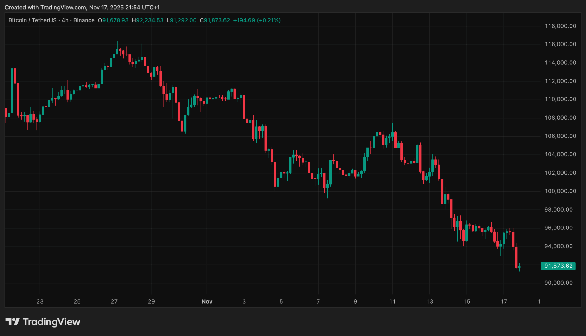 Der Kryptomarkt stürzt kräftig ab. Bitcoin (BTC) ist am Montag stark eingebrochen und fiel sogar unter 92.000 US-Dollar – der niedrigste Stand seit Monaten. Auch Ethereum (ETH) rutschte unter eine wichtige Unterstützung, während die Verluste bei gehebelten Händlern auf Hunderte Millionen anwachsen.